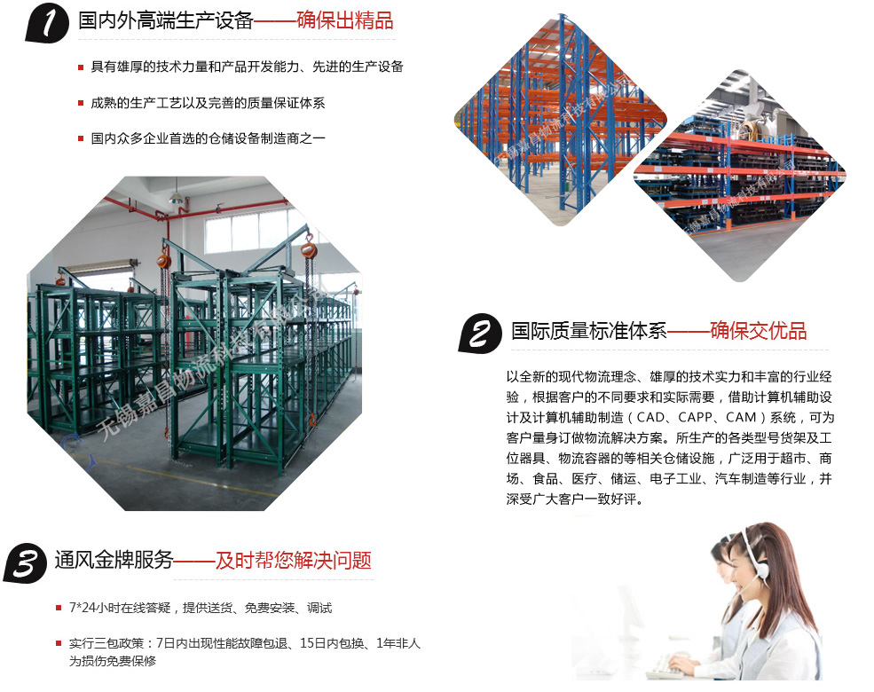 無(wú)錫嘉昌倉(cāng)儲(chǔ)貨架有限公司是國(guó)內(nèi)現(xiàn)代倉(cāng)儲(chǔ)物流技術(shù)開(kāi)發(fā)、設(shè)計(jì)、生產(chǎn)和安裝的專(zhuān)業(yè)廠家,具有雄厚的技術(shù)力量和產(chǎn)品開(kāi)發(fā)能力、先進(jìn)的生產(chǎn)設(shè)備、成熟的生產(chǎn)工藝以及完善的質(zhì)量保證體系。公司始終“以質(zhì)量求生存,以信譽(yù)求發(fā)展的”的經(jīng)營(yíng)理念,放眼世界,積極引進(jìn)、吸收國(guó)際物流行業(yè)先進(jìn)技術(shù),憑借專(zhuān)業(yè)的制作經(jīng)驗(yàn)、優(yōu)秀的產(chǎn)品質(zhì)量,是國(guó)內(nèi)眾多企業(yè)首選的倉(cāng)儲(chǔ)設(shè)備制造商之一。